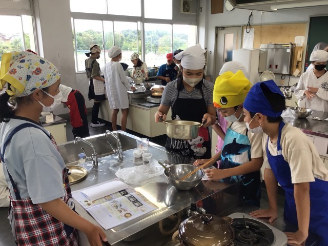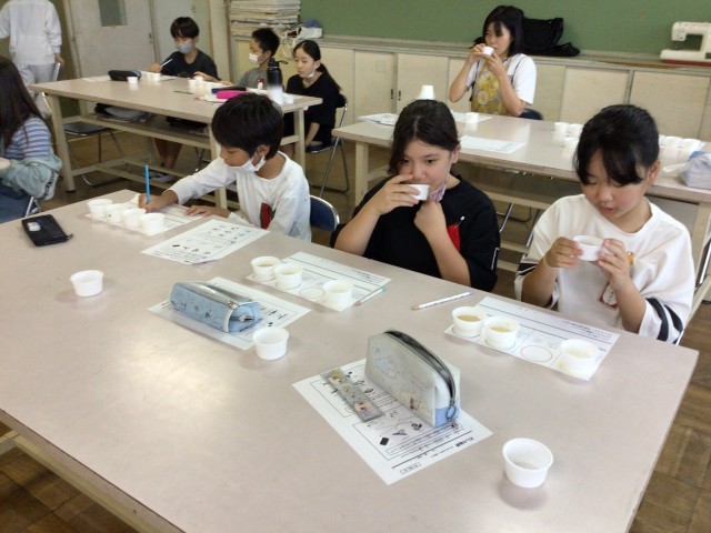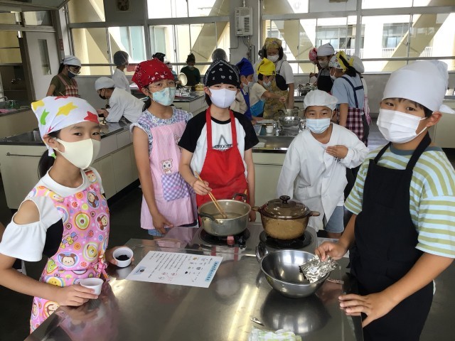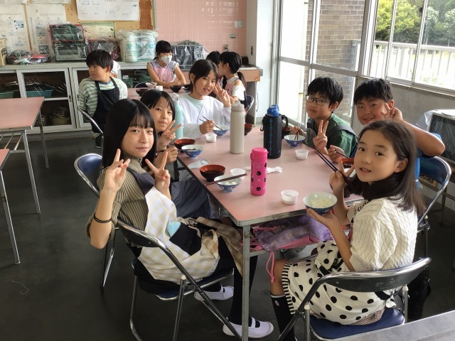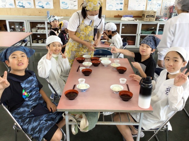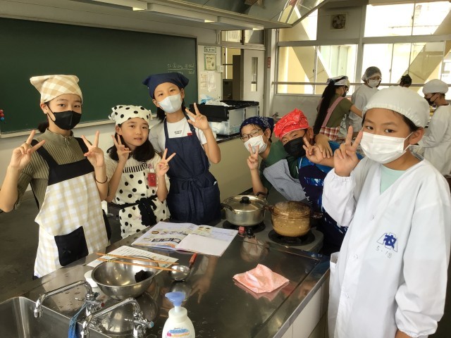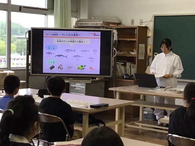 ユタカフーズさんに出前授業を行っていただきました。各クラス1時間目には、最初に「だし」についての説明を聞き、実際に4種類のだしの香りを嗅いだり、味わったりして比べながら、だしについて学びました。だしは全国各地で様々なものが使われていることや、だしを組み合わせると相乗効果によって、うまみが増すことがわかりました。2時間目には、だしパックを使ってみそ汁を作り、ご飯と一緒に食べました。児童たちは、みそを湯に溶かしたものとだしと合わせたものを飲み比べたことにより、だしの大切さを実感できたようです。また、今回使用したお米は5月に田植えをし、今月稲刈りをして収穫したものです。児童たちは農家の方の大変さをかみしめながら、味わっていました。炊き立ての新米は香りもよく、みずみずしくてとてもおいしかったとの声がたくさん聞こえてきました。