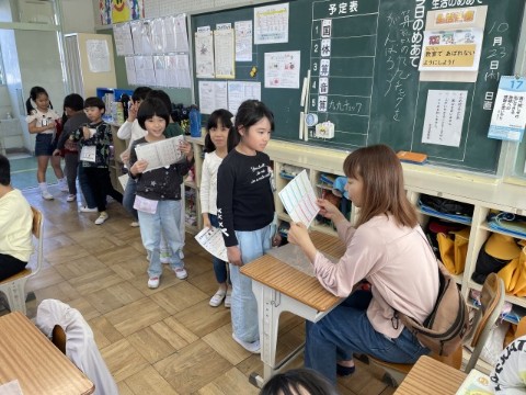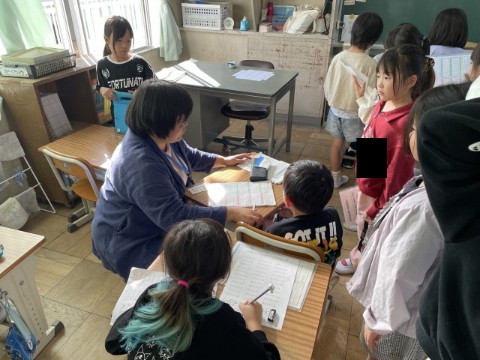 【2年生】10/22 九九チェック 公開日 2025/10/23 更新日 2025/10/23 2年生 2年生は九九のチェックを行いました。普段は担任の先生と行っていますが、より多くの子がチェックを受けられるように、おてての会の方にも協力してもらいました。いつもとは異なる人の前でチェックを受けて、緊張している様子もありましたが、「ゆっくりがんばってね」「もう1回チャレンジしてみよう」という前向きな言葉をかけてもらい、一生懸命がんばることができました。