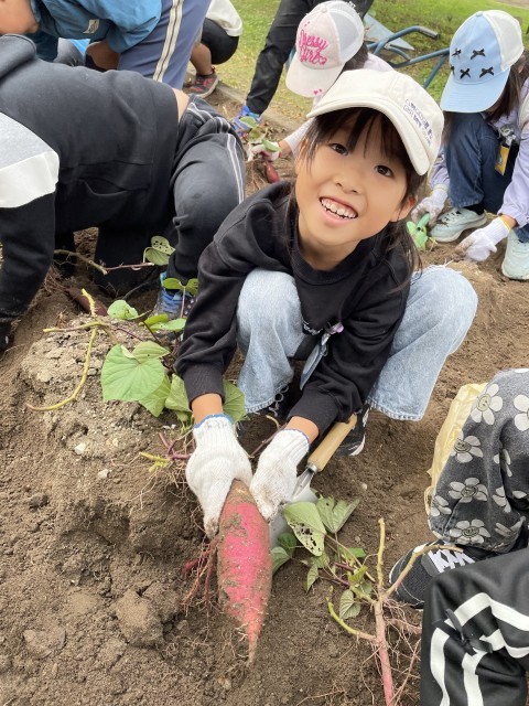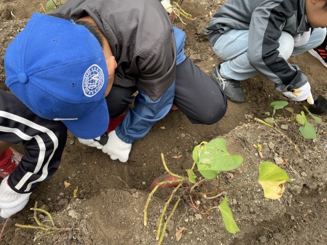 傷つけないよう、慎重に掘っていきました。土の中のさつまいもを見つけると、「あった!」「ここだよ!」などと声を上げて、一生懸命楽しそうに作業していました。いろいろな大きさや形のさつまいもを見て、子どもたちも大満足の様子でした。