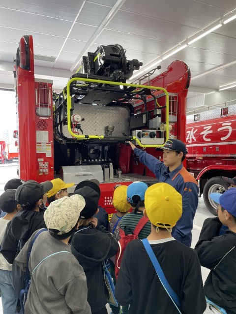 普段は見られない消防署の内部や、消防車や救急車の中を間近で見せていただくことができました。子どもたちは興味をもって話を聞き、積極的に質問をしたり、メモをとったりしながら学ぶ姿が見られました。