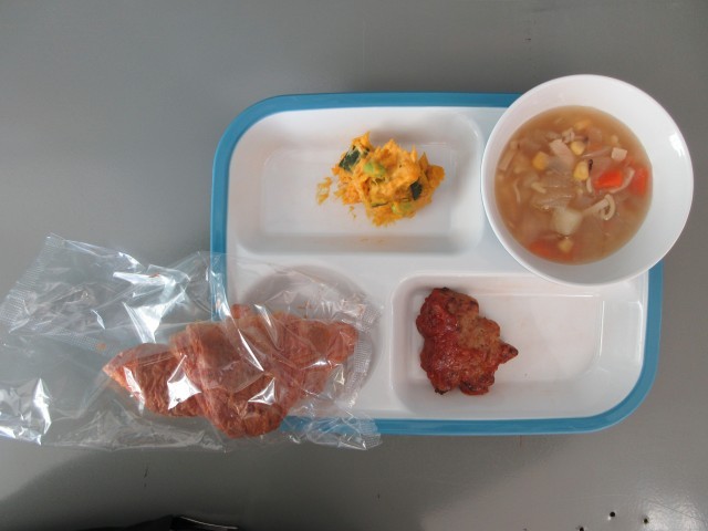 今日の給食は、牛乳、クロワッサン、ハンバーグのケチャップソースかけ、かぼちゃサラダ、ABCスープとセレクトデザートでした。