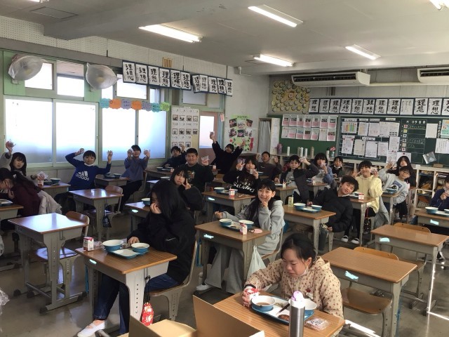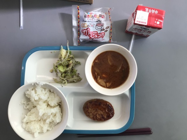 今日の給食は、ご飯・照り焼きハンバーグ・キャベツのゆかり和え・豚汁・米粉のガトーショコラです。