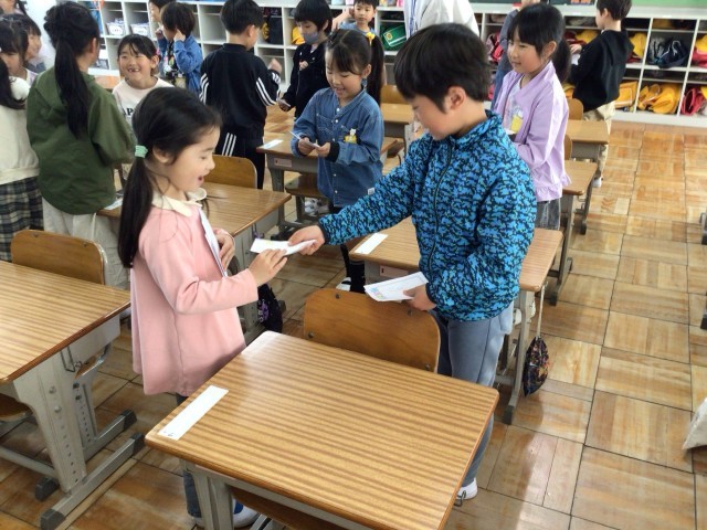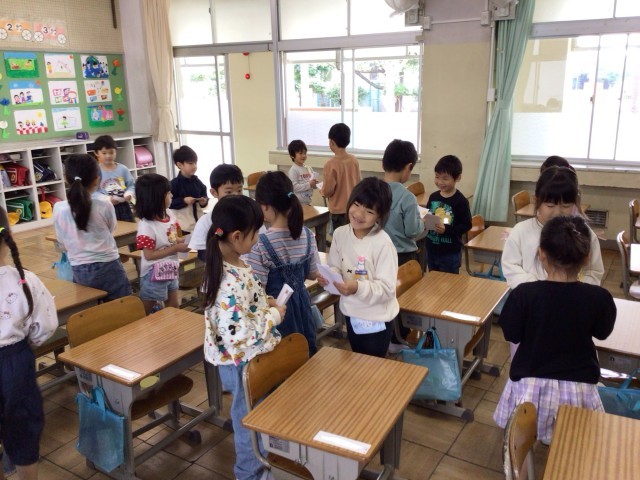 各クラスで作った名刺の交換会をしました。「これからよろしくね」と元気に挨拶をしながら、いろんなお友達と交流できました。自分から積極的に声をかけに行き、名刺がたくさん集まってきたときの嬉しそうな笑顔が印象的でした。