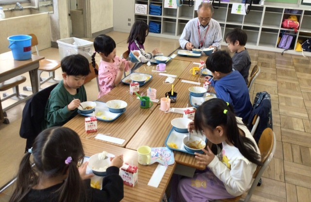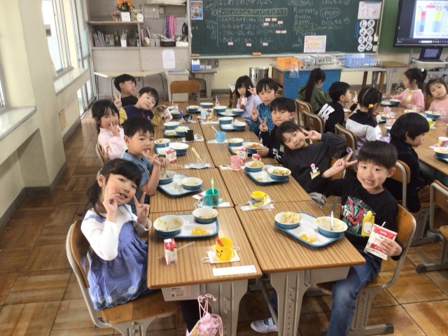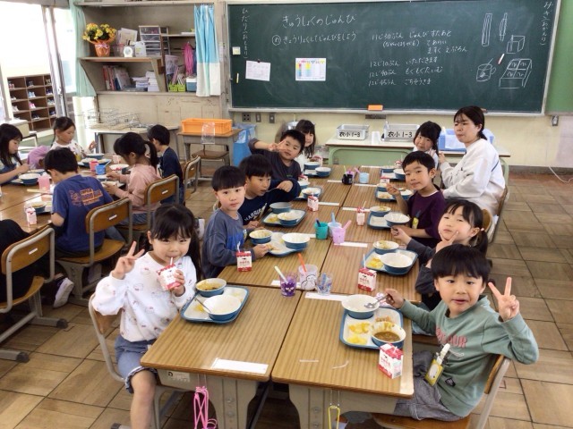 今日は、はじめての給食でした。初めての配膳作業でしたが、全員で協力しスムーズに準備することができました。