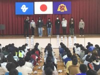 武豊町の生産者が育てたお米や武豊町で作られた豆みそやたまりを使っていることを、給食委員の児童が放送で紹介しました。