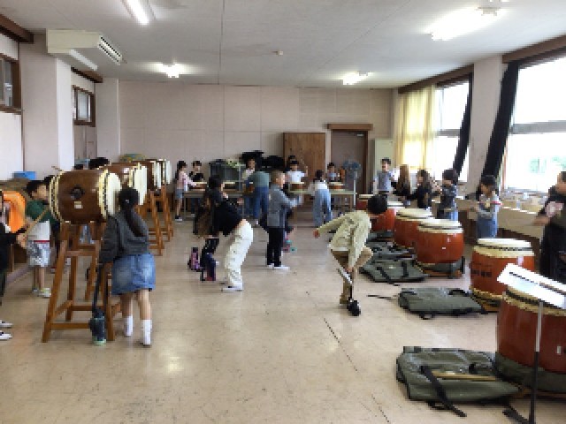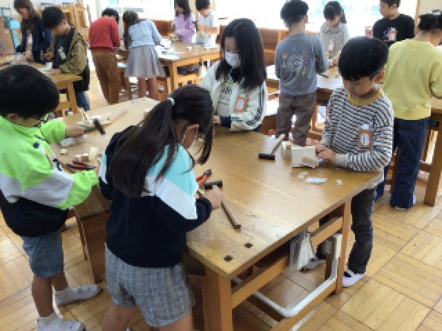 3年生は図工で、金槌を使って釘を打ち、木を組み立てていました。5年生の家庭科では、保護者の方に見守っていただきながら、包丁を使ってジャガイモの皮をむいたり芽を取ったりしていました。2年生の音楽では、ずらっと並んだ太鼓を、みんなで順番に叩いていました。どの活動も真剣な表情で、安全に気をつけて、楽しく活動していました。