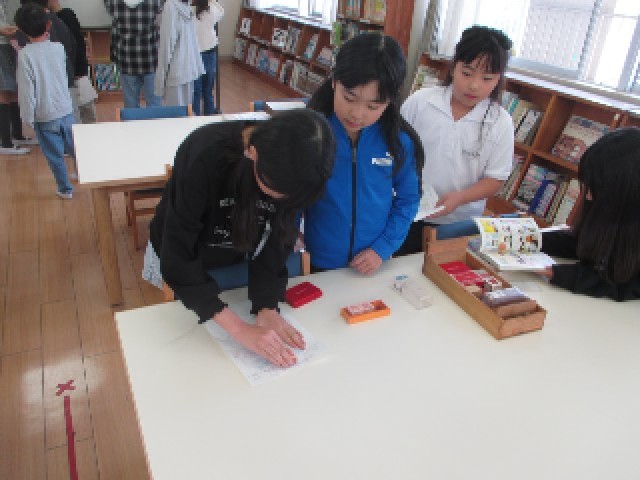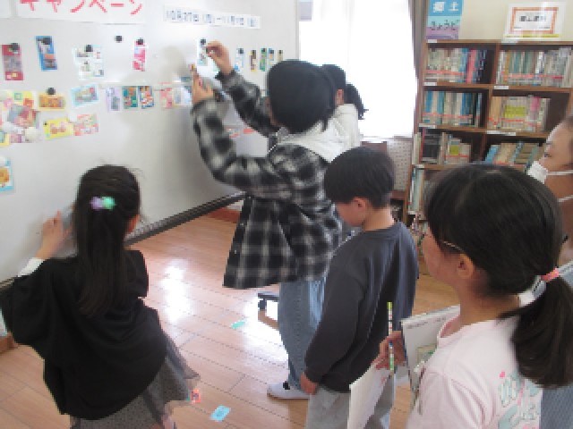 月曜日から始まった「読書の秋 すごろくキャンペーン」ですが、5日間本を続けて借りたことで、すごろくのゴールまでたどりついた子が何人もいました!ゴールできた子は、すごろくの紙を図書委員に見せてスタンプを押してもらいました。その後、たくさんある中から気に入ったしおりを手にしてうれしそうにしていました。