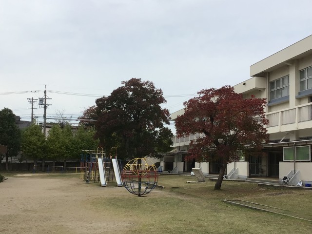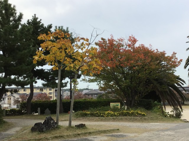 朝晩の気温が下がって、学校の木々も色とりどりに変わっています。かりんの木も実をつけています。