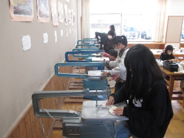体育館では3年生がポートボールの試合をしていました。図工室では、4年生がのこぎりを使って、6年生が電動糸のこぎりを使って活動していました。電動糸のこぎりは操作が難しいようで、様子を見に行ったときには、のこぎりの刃が何本か折れてしまったようでした。