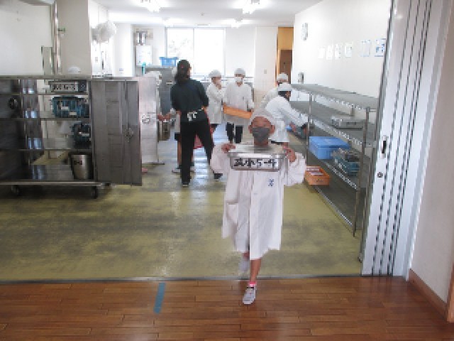4時間目が終わると給食です。給食当番は配膳室に給食を取りに行きます。クラス分の給食なので重さがありますが、協力して運んでいました。