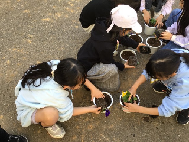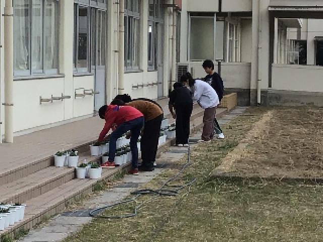 6年生の卒業や新1年生の入学を祝うため、全校児童が一人一鉢の花を育てる活動に取り組みます。式の会場を華やかに飾るため、これから毎日お世話をしていきます。休み時間には鉢への水かけを行ったり、花を摘んだりと心を込めてお世話をしてくれていました。