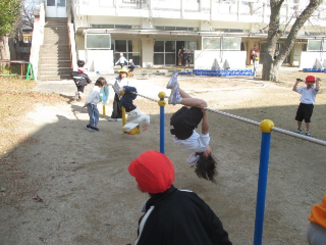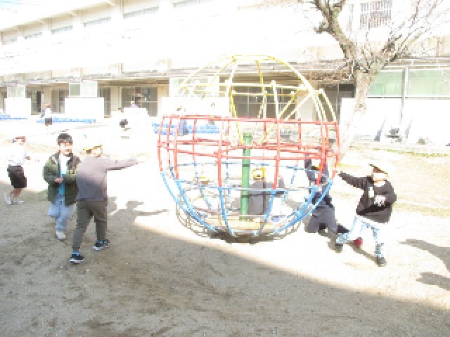 空気は冷たいですが天気はよく、子どもたちは元気よく外で遊んでいます。1年生は、教室前の中庭で、遊具で遊んだり、なわとびをしたり、鬼ごっこをしたりしていました。