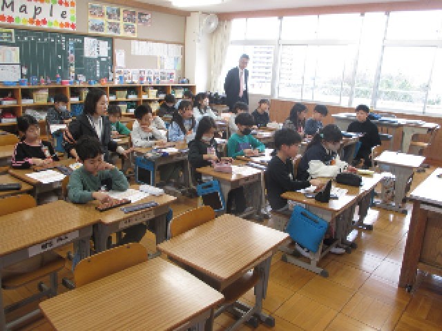 3年生では算数の授業でそろばんをしました。講師の方にそろばんの使い方を教えていただきました。そろばんを使ってたし算やひき算に取り組んでいました。