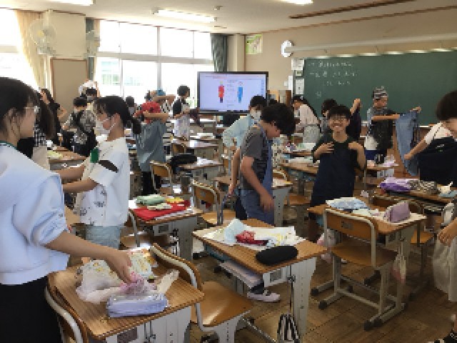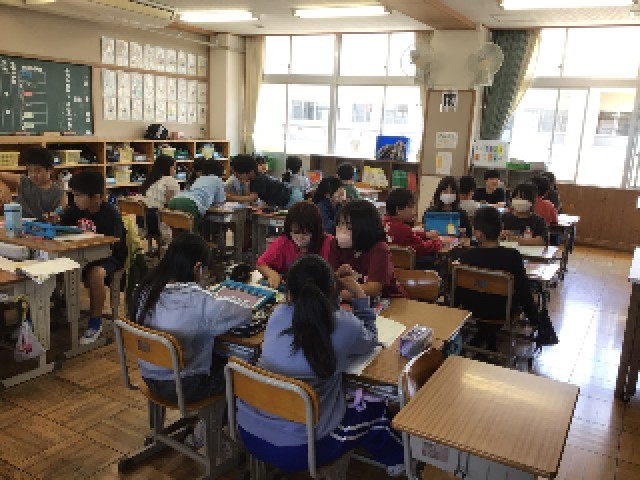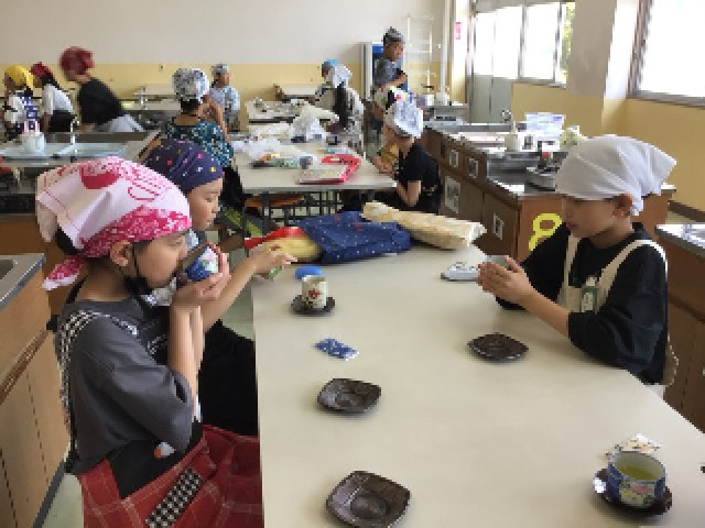 5年生では家庭科の授業が始まり、今日はお茶の淹れ方を学習していました。着慣れないエプロンを身に着けて、調理室でお茶を味わっていました。