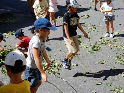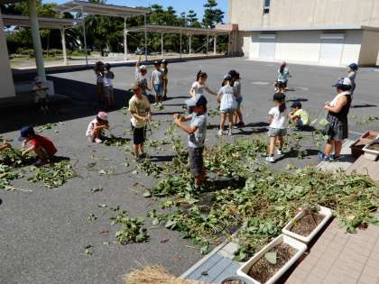 生活科で栽培している畑。そこで育ったイモのツルを使って子どもが遊んでいました。