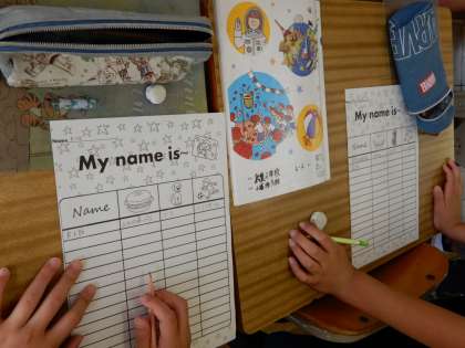 英語の教科書とカードを使って楽しく英会話に挑戦しています。