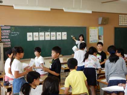 英語の授業は、ALT(外国語指導助手)と担任で授業を行います。武豊町教育委員会からALTは派遣された先生です。