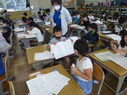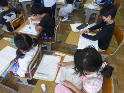 1年生から家庭学習の習慣をつくるためにカードを作成して、お家の方に協力していただいています。ありがとうございます。いっぱいになったカードを新しいものにしていました。