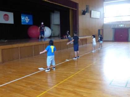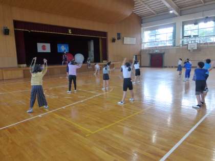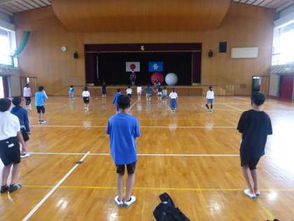 放課に体育館でラジオ体操を練習する体育委員会の子どもたち。町長さんの視察と同じタイミングでした。熱心に練習する姿をみていただけました。