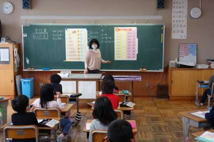 1時間目に、九九、四の段を暗誦していました。姿勢がいいですね!