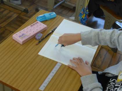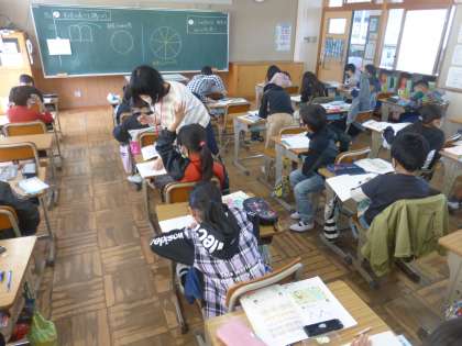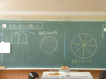 黒板にお手本の円が大きくかかれています。子どもたちに必要最小限の情報で分かりやすいです。