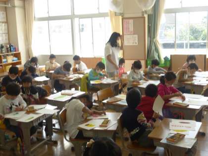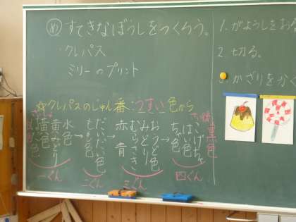 図工の作品を作っています。黒板にはクレパスの色を塗るときのポイントが明示してあります。これが大切です。