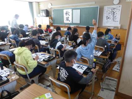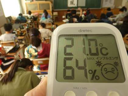 教室の3時間目の気温です。習字の授業、今日は清書です。
