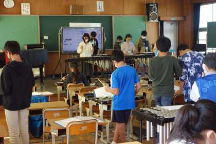 音楽の授業で合奏を行っています。いろいろな楽器が組み合わさって演奏されるととてもきれいな音色になります。さらにいい音目指してがんばりましょう。