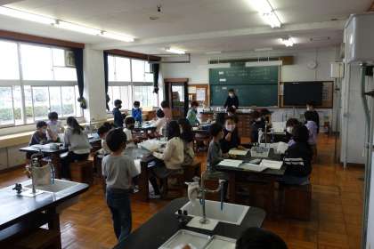 理科の授業で実験を行っています。班で協力し合って実験をしています。