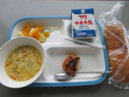 今日の献立は、愛知の米粉パン、鶏肉のバーベキューソースかけ、コーン卵スープ、フルーツのソーダゼリー和え、牛乳でした。美味しくいただきました。