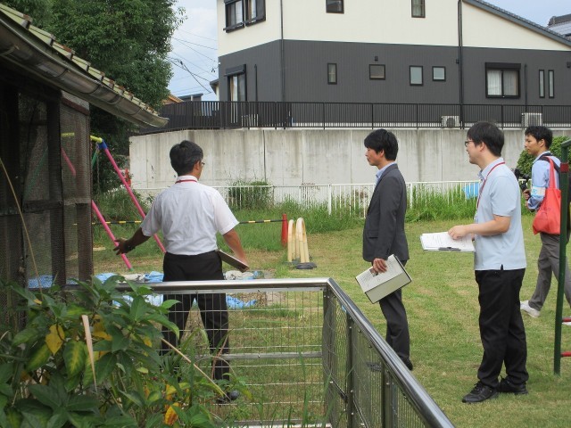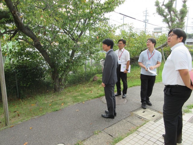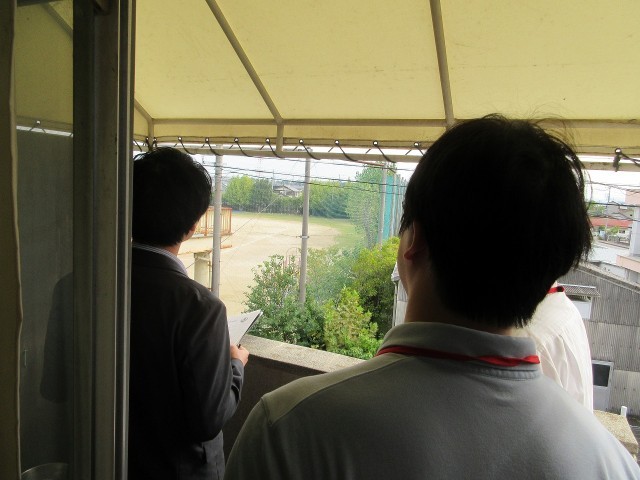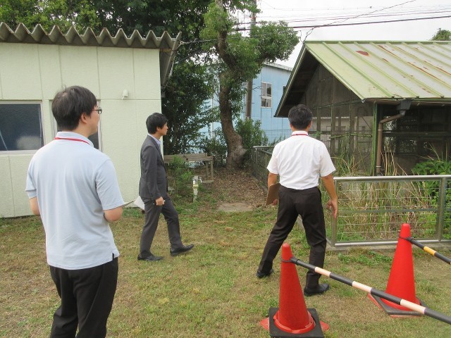 本校は、校舎のある校地から道路を隔てて運動場があります。子どもたちは毎日、校地と運動場をつなぐ歩道橋を使用して生活しています。町長さんは、その歩道橋や校地の様子についてじっくりと見てくださいました。お忙しい中、ありがとうございました。