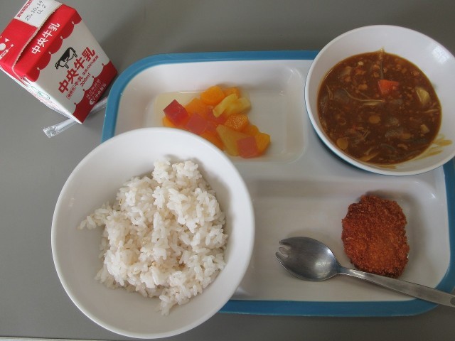 今日の献立は、麦ご飯、きのことひよこ豆のカレー、米粉チキンカツ、フルーツミックス、牛乳でした。