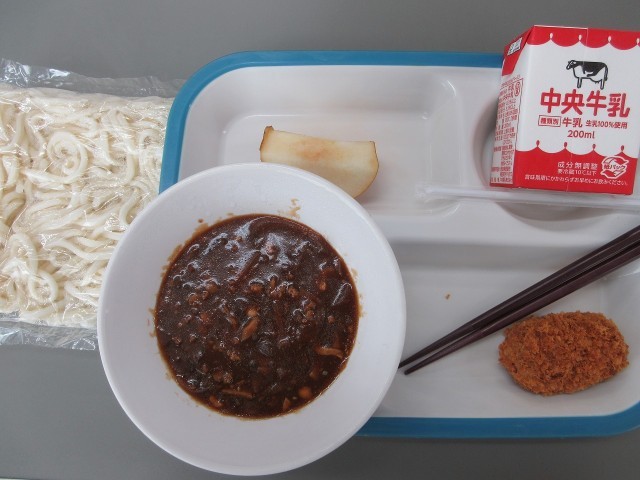 今日の給食は、ソフト麺、肉味噌かけ汁、豆乳クリーミーコロッケ、梨、牛乳でした。