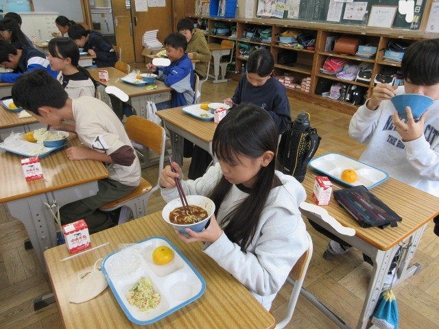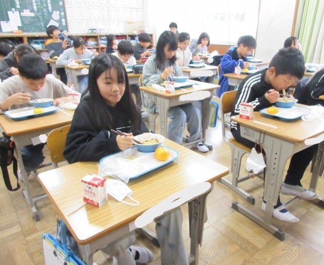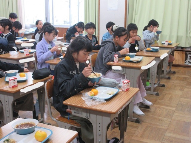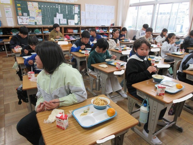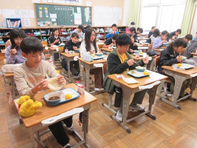 今日のふきっ子5年生の給食時間の様子です。5年生はいつも食缶が空っぽになるほど、たくさん食べます。