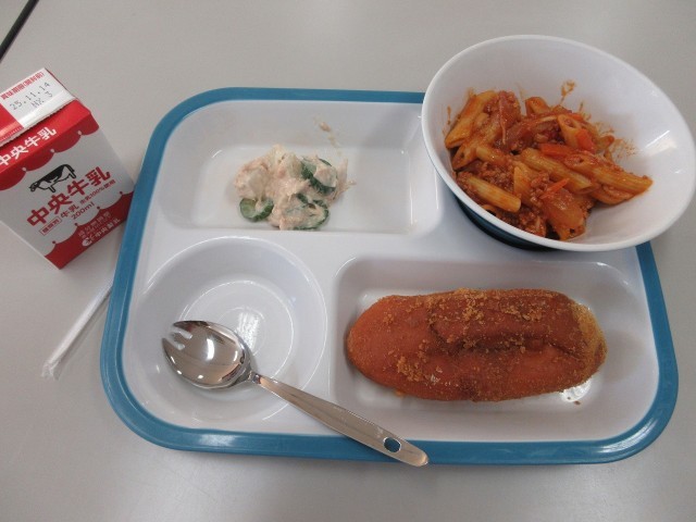 今日の献立は、きな粉揚げパン、ミートソースペンネ、ポテトサラダ、牛乳でした。きな粉揚げパンは、ふきっ子の大人気メニューです。子どもたちに大人気なメニューを今日は保護者の方々にも食べていただきました。きな粉揚げパンはもちろんのこと、ミートソースペンネも大好評でした。