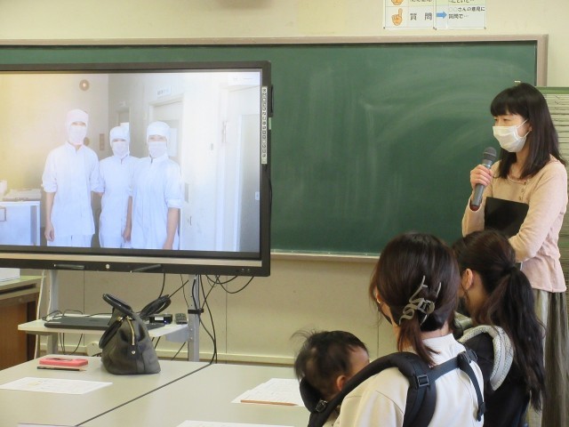 給食の後は、栄養主査の先生による食育講話でした。まずは、給食センターについて動画で紹介してくださいました。その後は、カルシウムについてお話をしてくださいました。