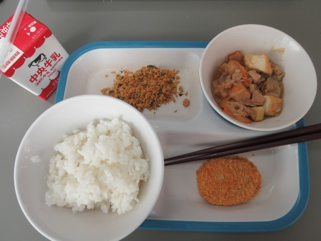 今日の給食は、ご飯、鮭と青菜ご飯の具、さつまいもコロッケ、生揚げの煮物、牛乳でした。