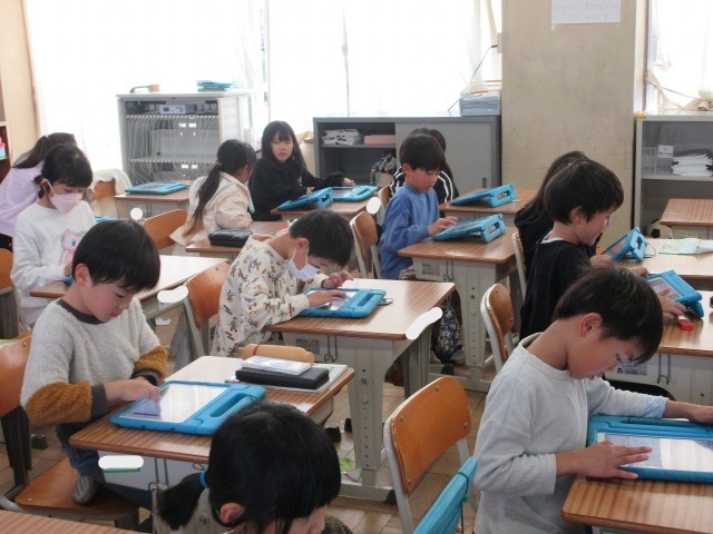 ふきっ子2年生の授業の様子です。タブレット端末を使った学習では、ICT支援員の先生に教わりながら学習しています。