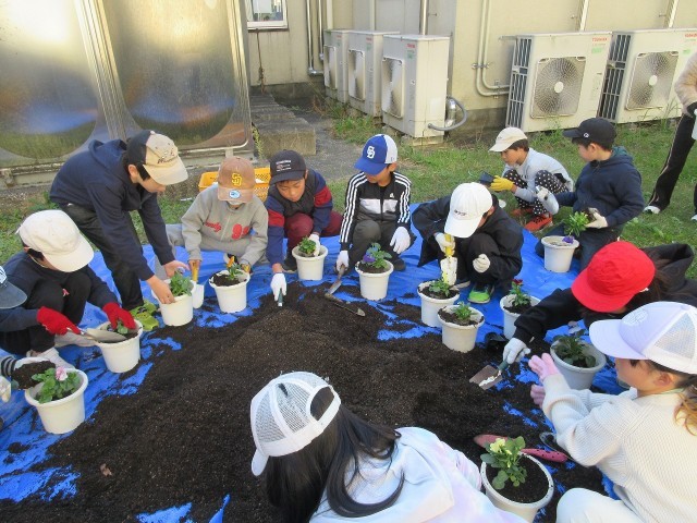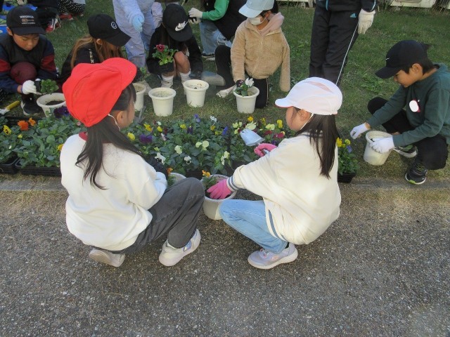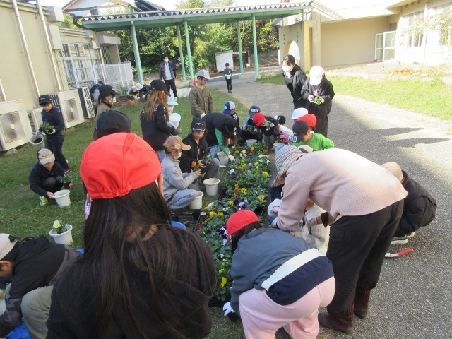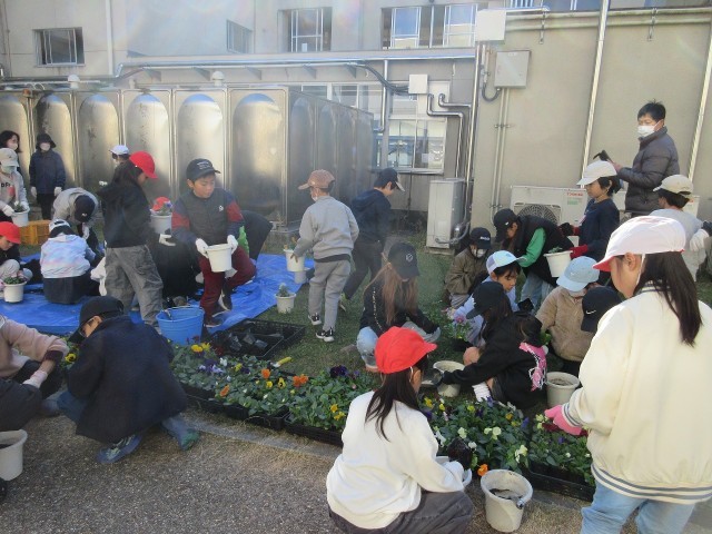2時間目、3年生のふきっ子花壇作業がありました。今日は、日時計花壇にパンジーの苗を定植する作業と卒業式に体育館内を飾る花の鉢づくりです。PTA校内整備部員の方々と3年生の保護者の方が子どもたちと一緒に作業をしてくださいました。