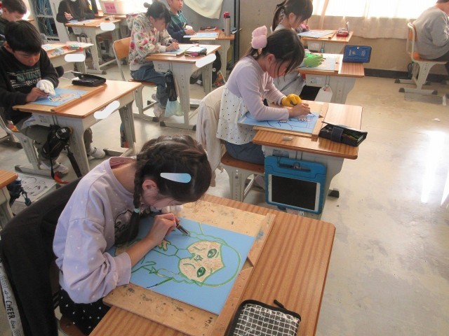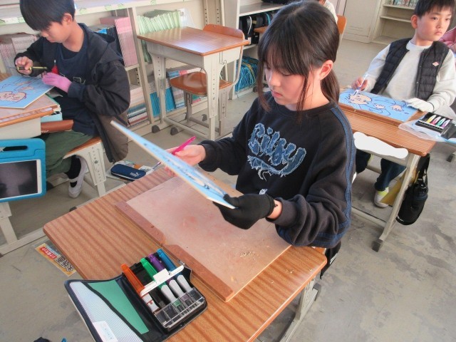 今日のふきっ子4年生の授業の様子です。図画工作科では、版画の版づくりです。丁寧に彫り進めています。