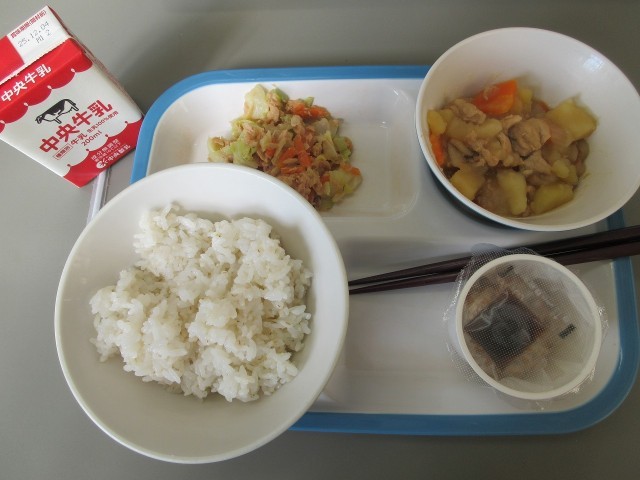 今日の献立は、麦ご飯、納豆、キャベツのツナ和え、肉じゃが、牛乳でした。