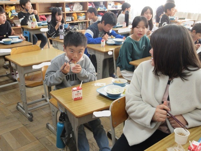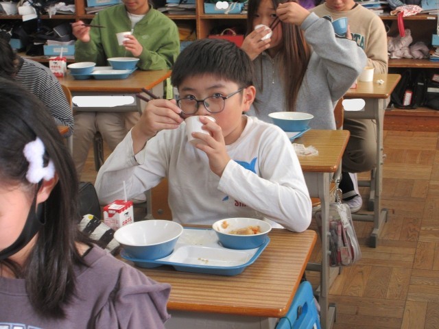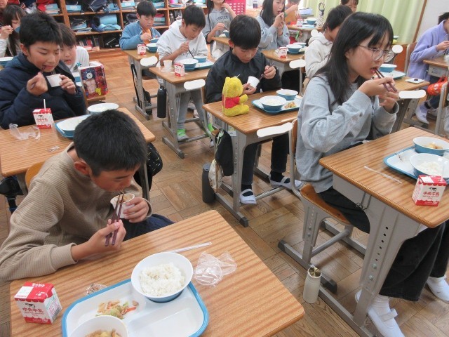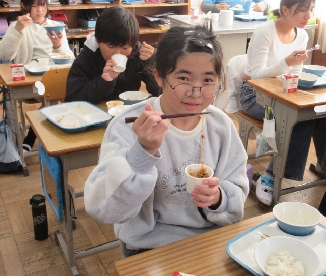 今日のふきっ子5年生の給食時間の様子です。今日の献立の納豆は、ご飯に混ぜて食べる子、そのまま食べる子と食べ方がさまざまでした。