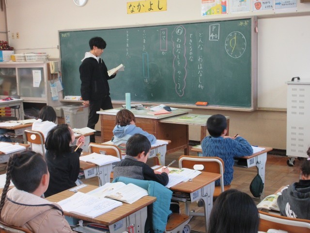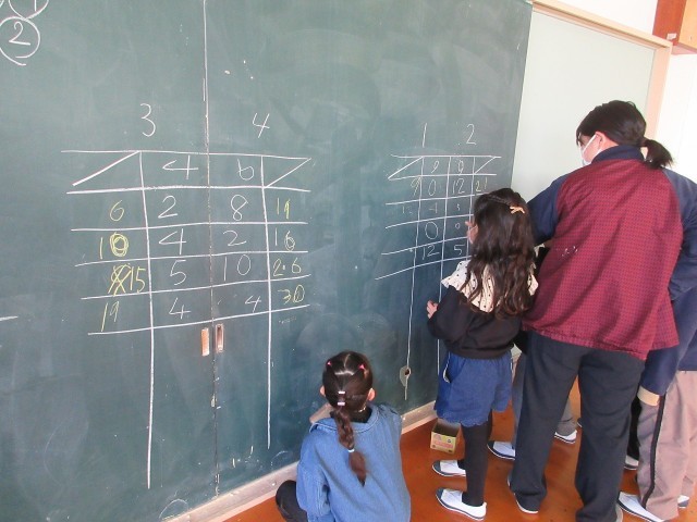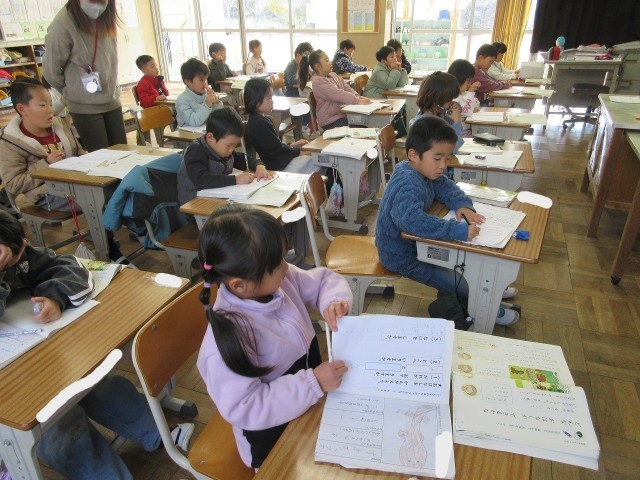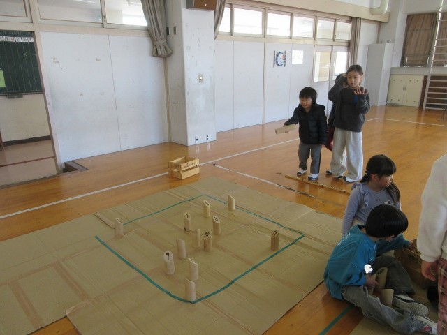 今日のふきっ子1年生の授業の様子です。モルックを使って、友達と楽しんだり、たし算の計算をしたりしています。国語では「どんな おはなしが  できるかな」の学習をしています。絵を見て、お話を考えています。