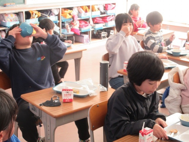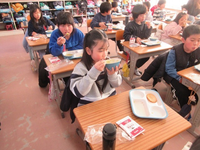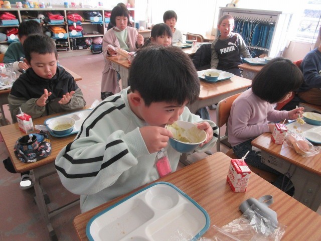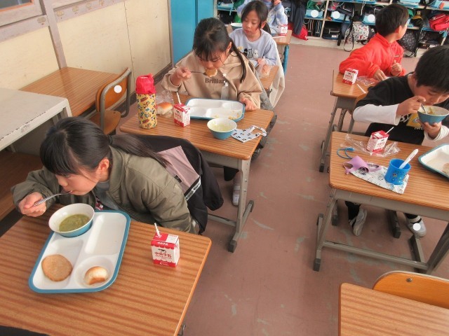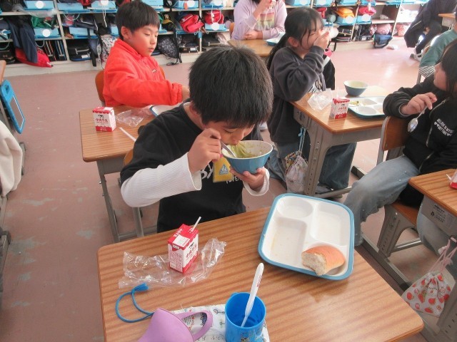 今日のふきっ子3年生の給食時間の様子です。3年生もほうれん草のポタージュスープ、おいしそうに食べていました。