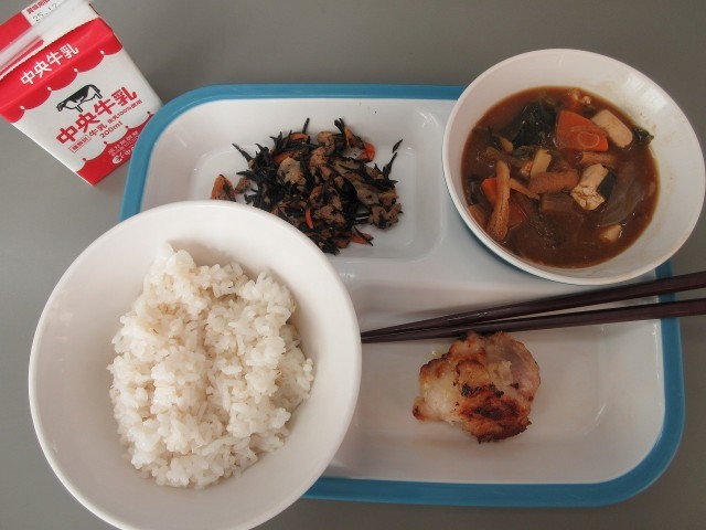 今日の献立は、麦ご飯、鶏肉の塩麹焼き、ひじきの炒め煮、里芋と大根の味噌汁、牛乳でした。鶏肉の塩麹焼きは、肉が柔らかくジューシーでとっても美味しかったです。