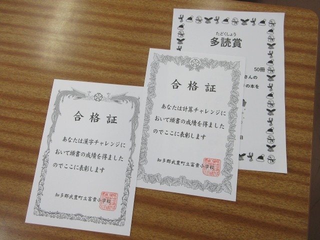 今日のふきっ子3年生の学活の様子です。通知表の他に多読賞、漢字チャレンジ・計算チャレンジの合格証が配られました。