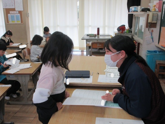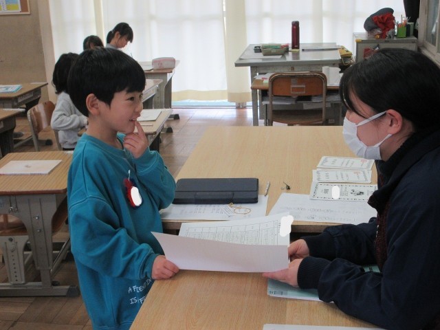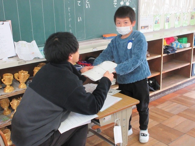 今日のふきっ子1年生の学活の様子です。1年生も、先生が一人一人に2学期のがんばりを伝えながら通知表を渡していました。子どもたちは、嬉しそうな照れくさそうな表情でした。