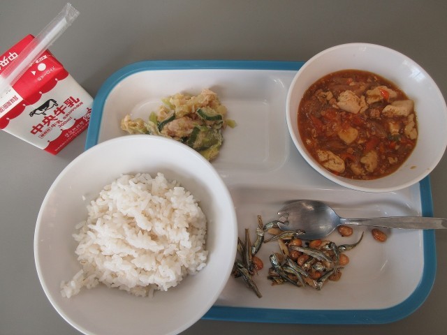今日の献立は、麦ご飯、マーボー豆腐、棒々鶏サラダ、大豆と小魚のアーモンドがらめ、牛乳でした。