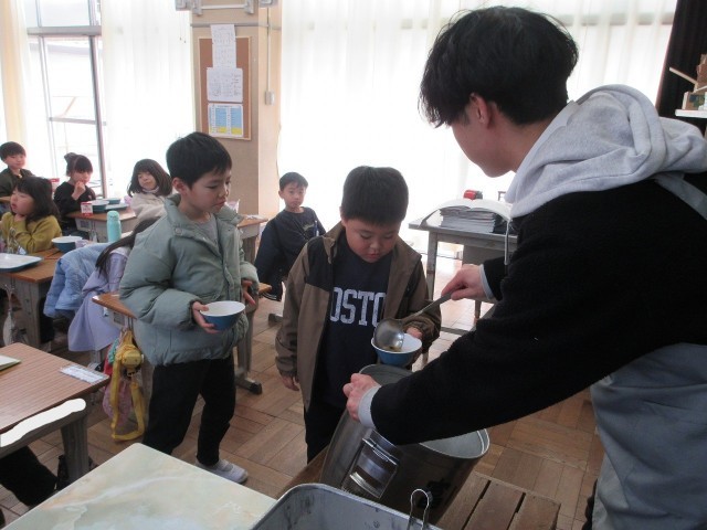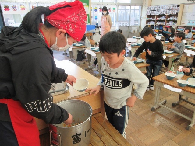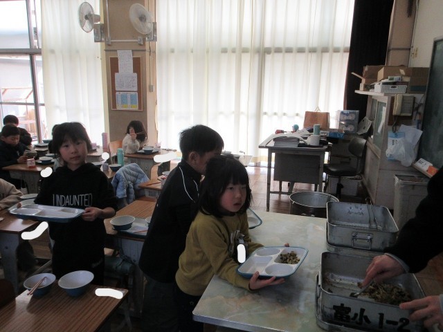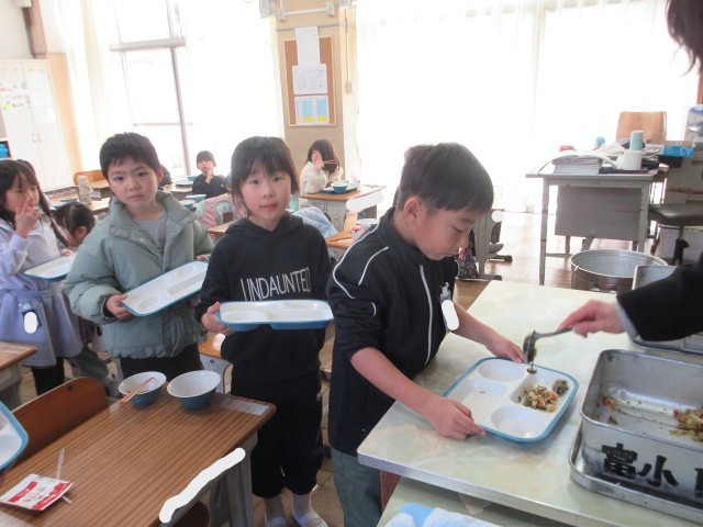 今日のふきっ子1年生の給食時間の様子です。おかわりにたくさんの子が並んでいました。入学した頃を思うと、驚くほどの食べる量です。頼もしくなりました。