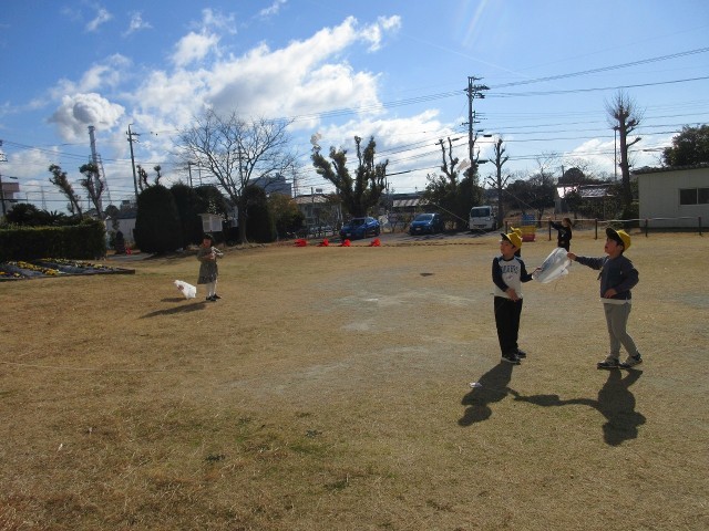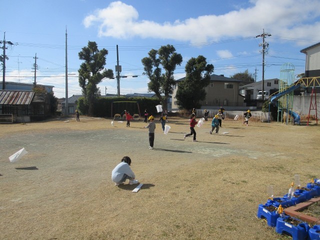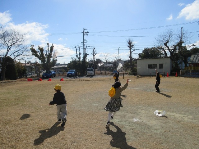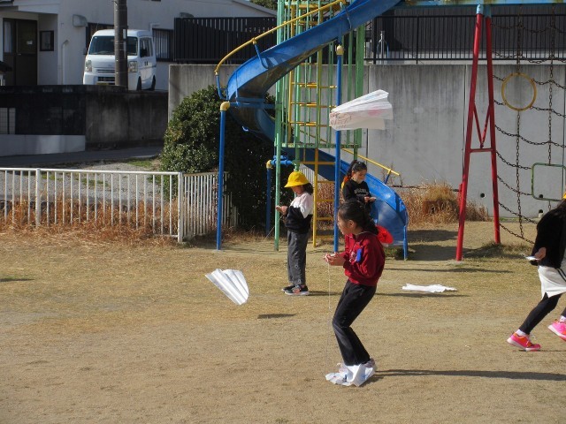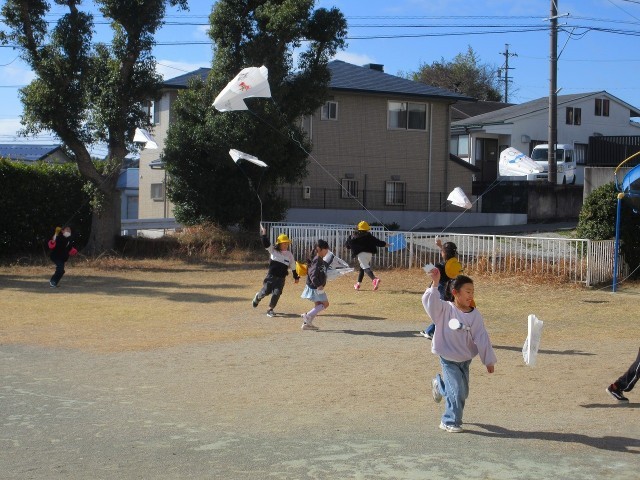 今日のふきっ子1年生の生活科の学習の様子です。自分たちで作成した凧を上げました。これまでにも何度か凧上げをしましたが、今日は少し風が強く、すぐに上がったかと思うと友達の凧と絡まってしまっていました。